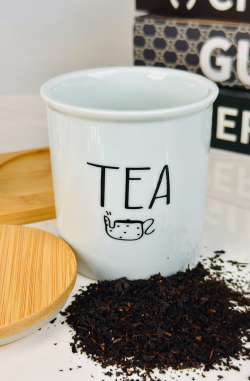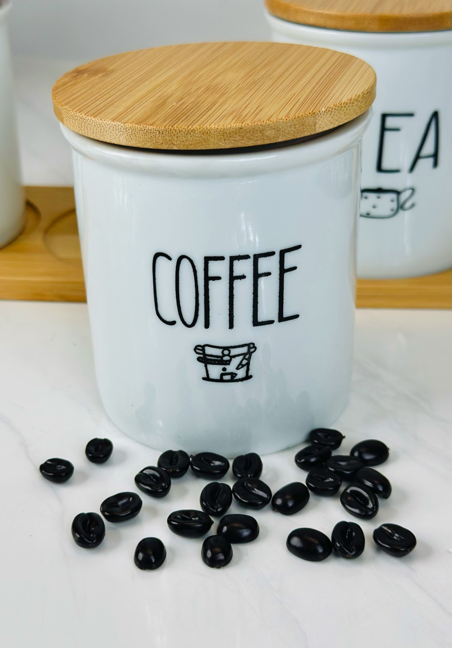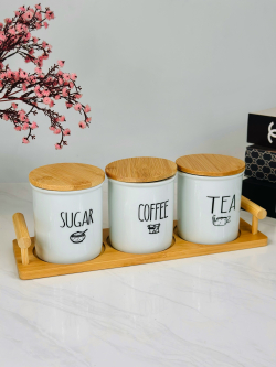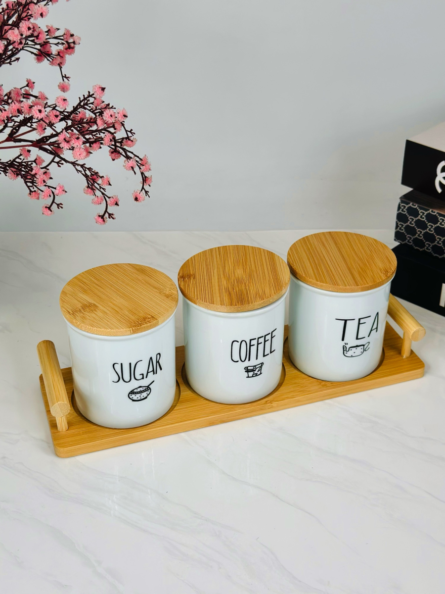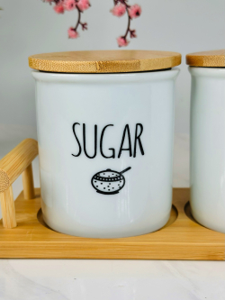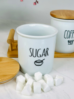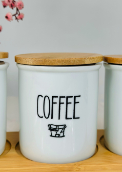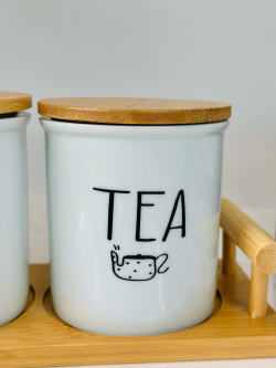 طقم سكر و شايي و قهوه سيراميك و قاعدة بامبو bh-3