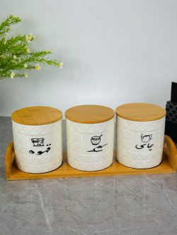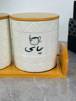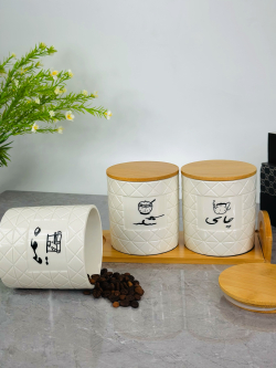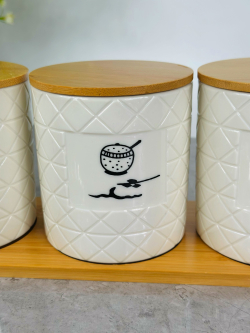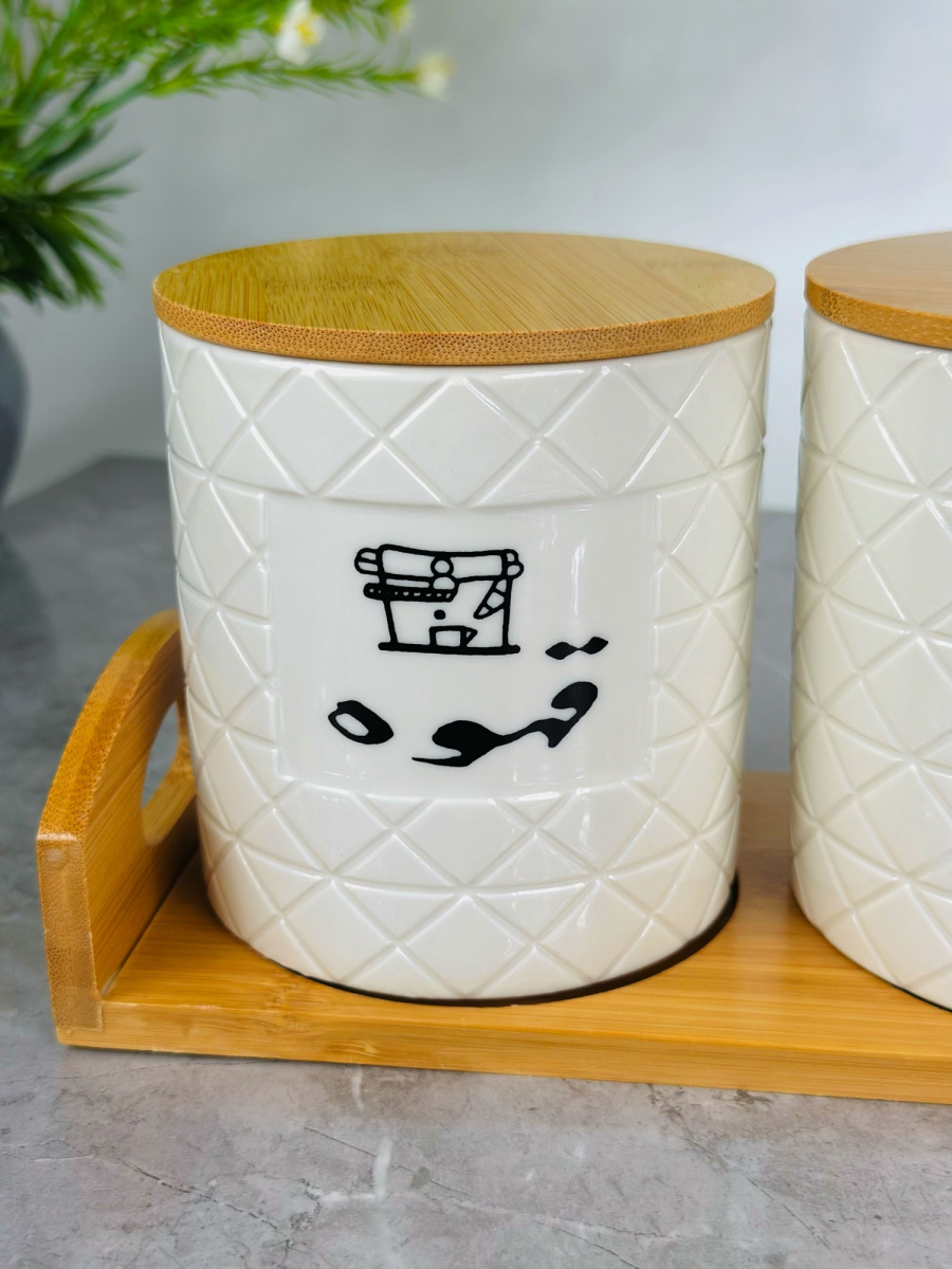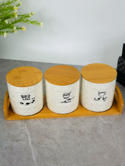 طقم سكر و شايي و قهوه سيراميك و قاعدة بامبو bh-1