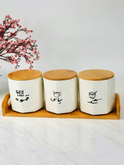 طقم سكر و شايي و قهوه سيراميك و قاعدة بامبو bh-3