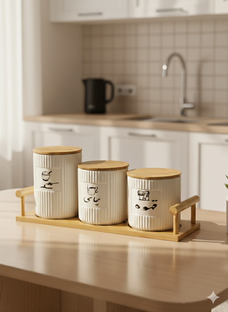 طقم سكر و شايي و قهوه سيراميك و قاعدة بامبو bh-6