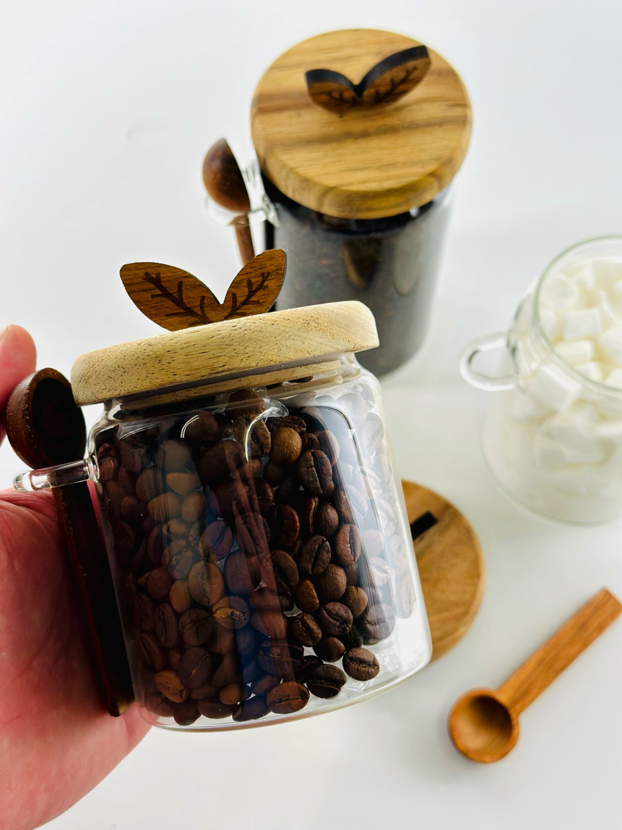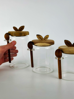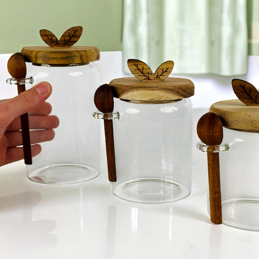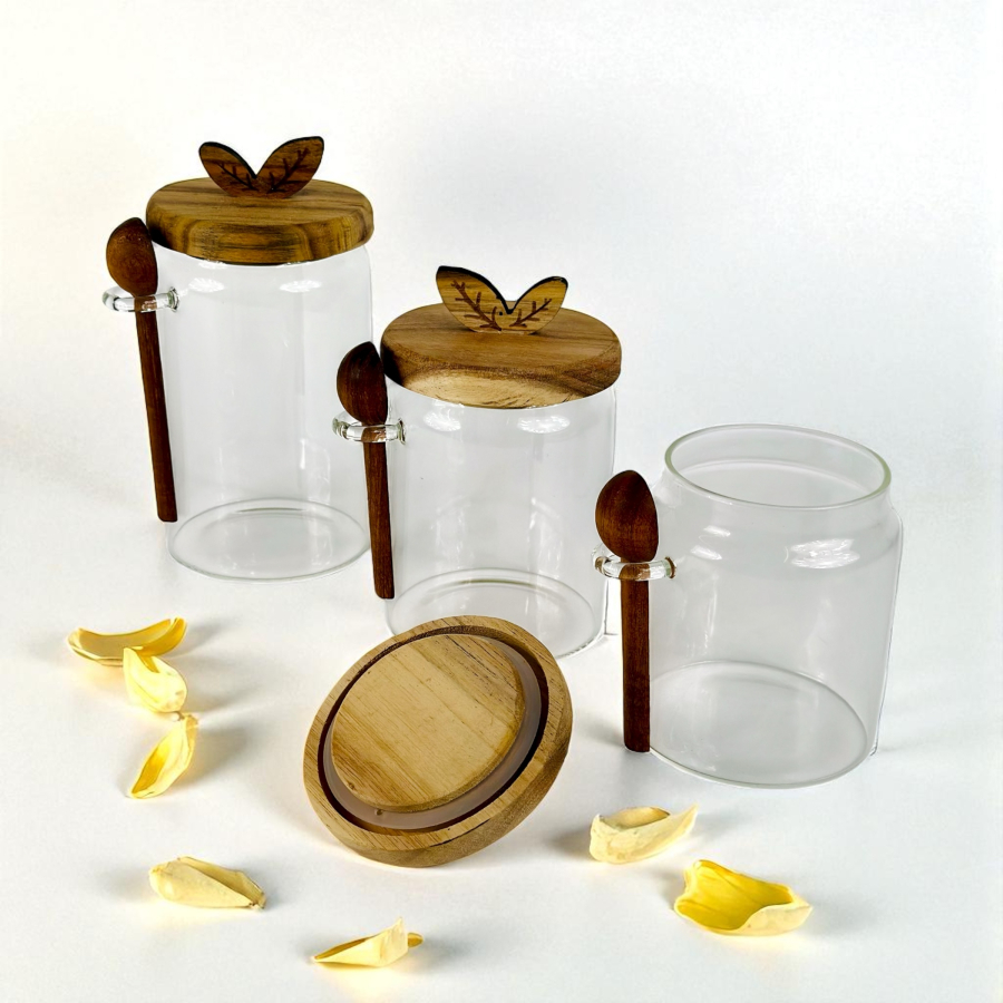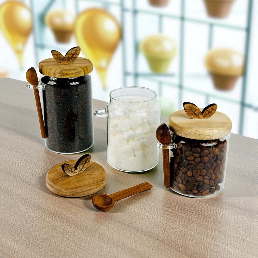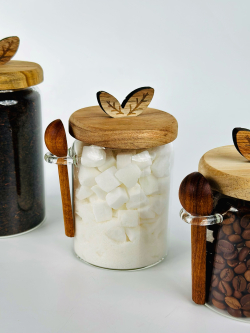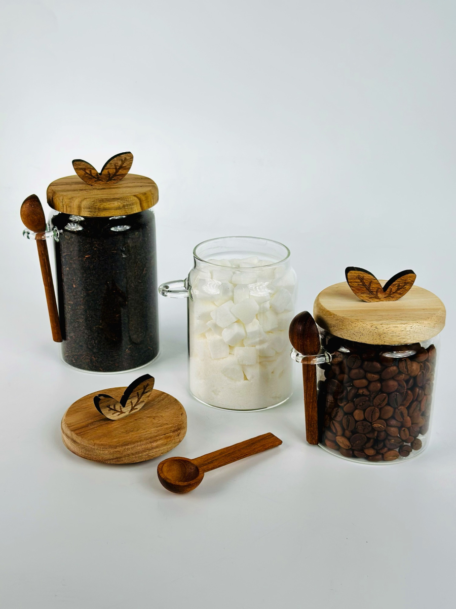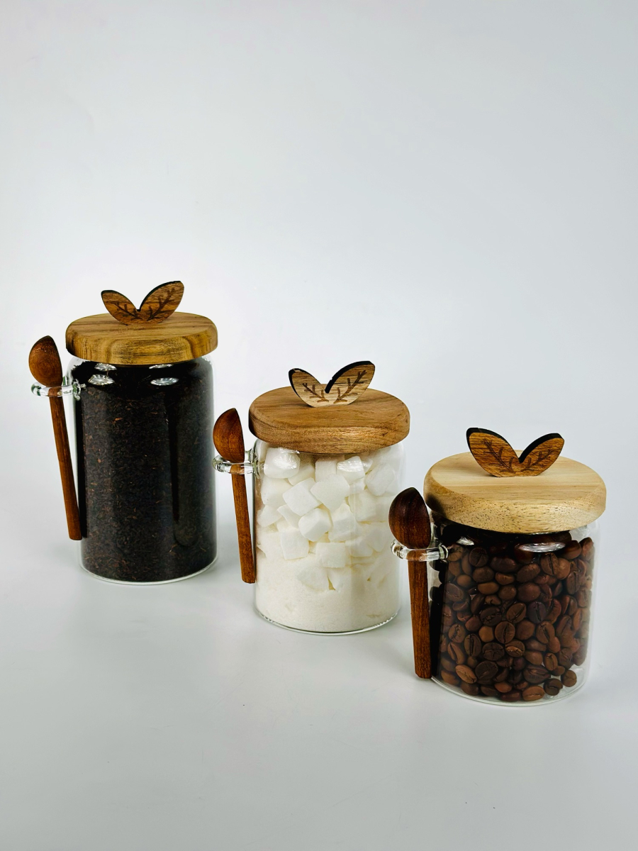 طقم سكر وشايي زجاج ثلاثي ويه ملاعق و قبق خشبي