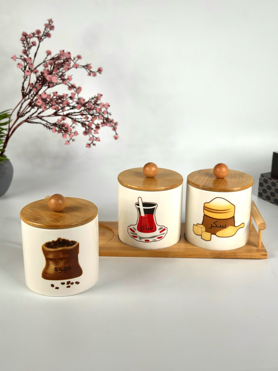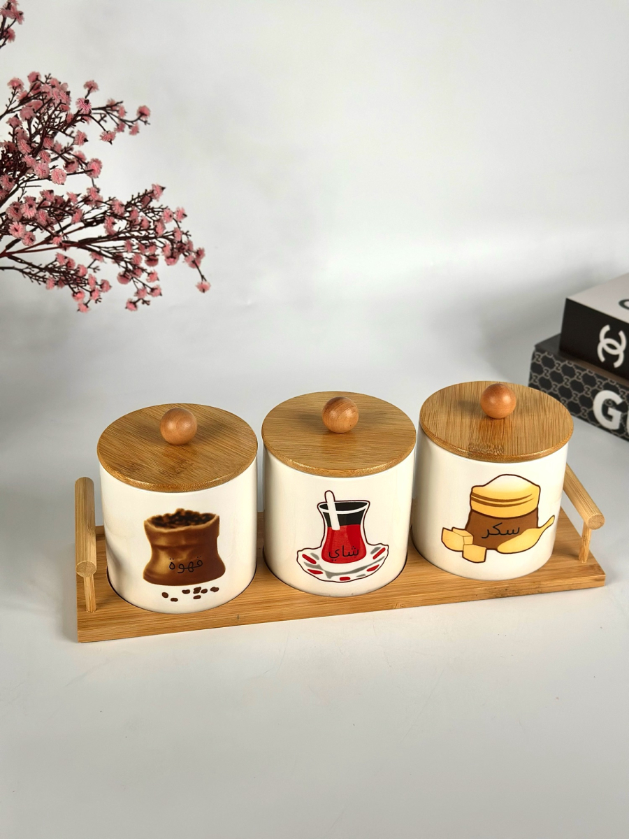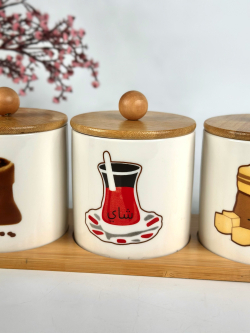 طقم سكر وشايي سراميك مصور مع ستاند بامبو قياس وسط