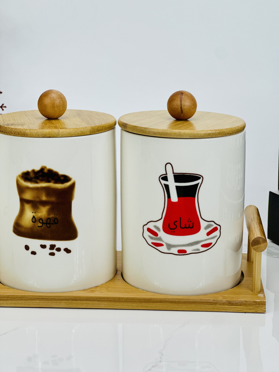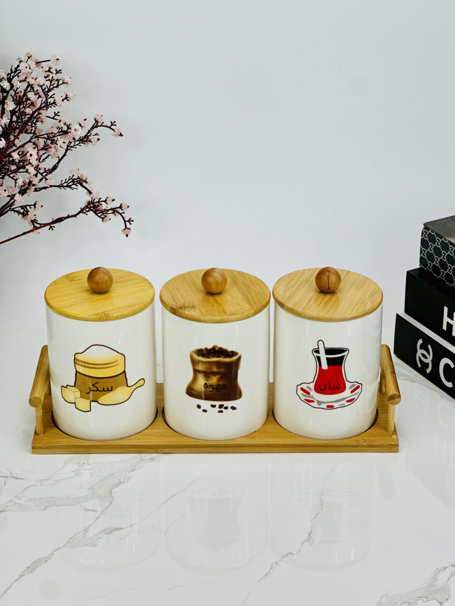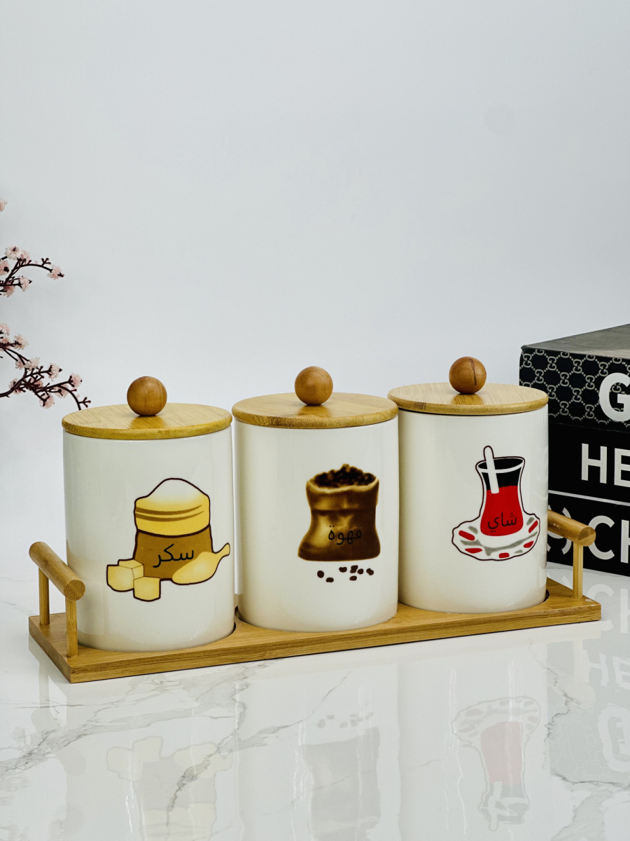 سيت سكر وشايي سراميك مصور مع ستاند بامبو قياس كبير