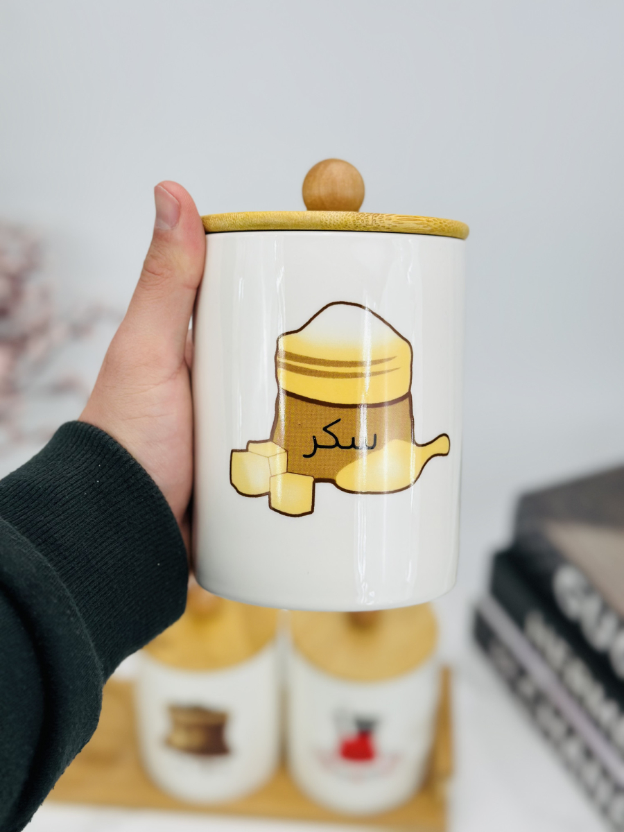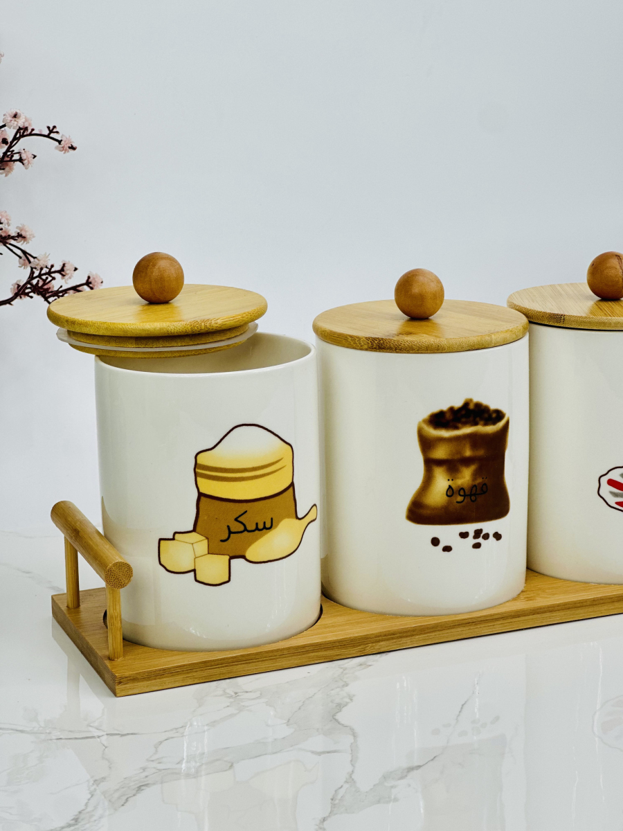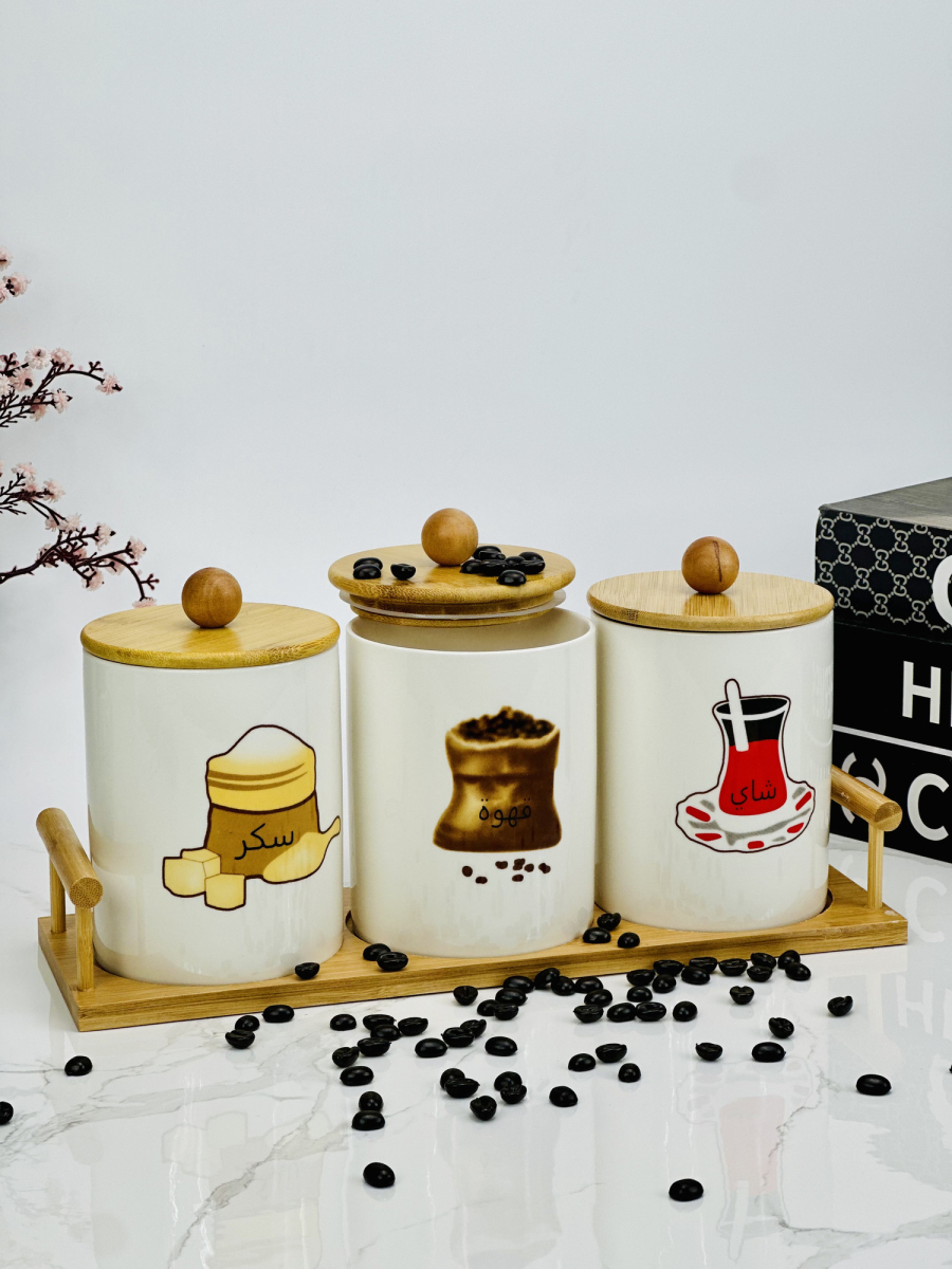 سيت سكر وشايي سراميك مصور مع ستاند بامبو قياس كبير