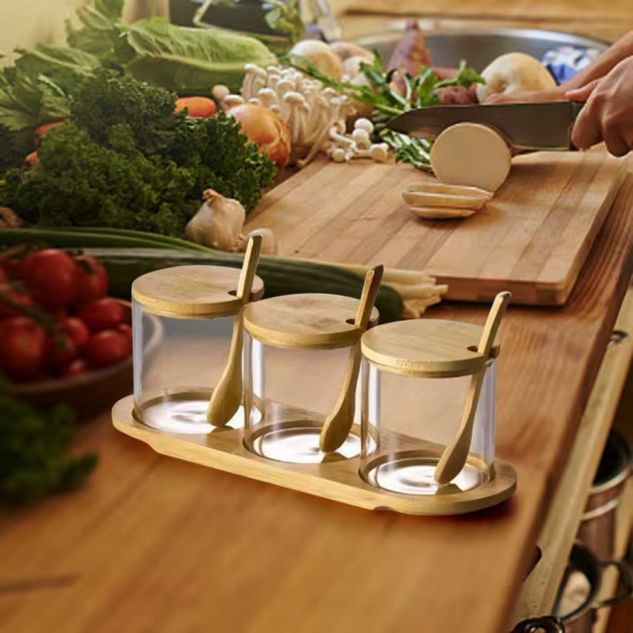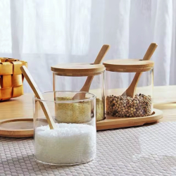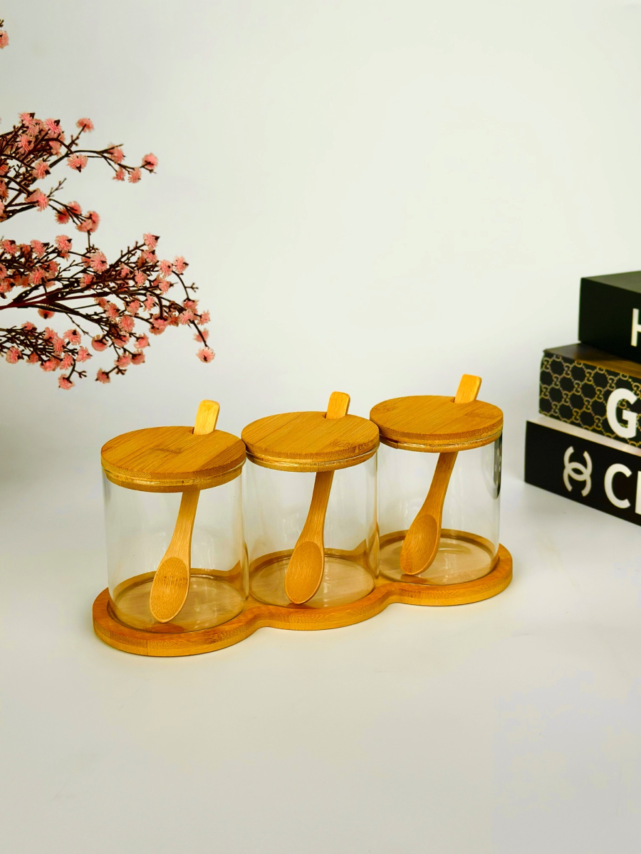 طقم بهارات او سكر و شاي زجاج ويه ملاعق و ستاند بامبو