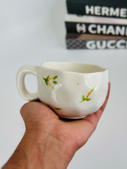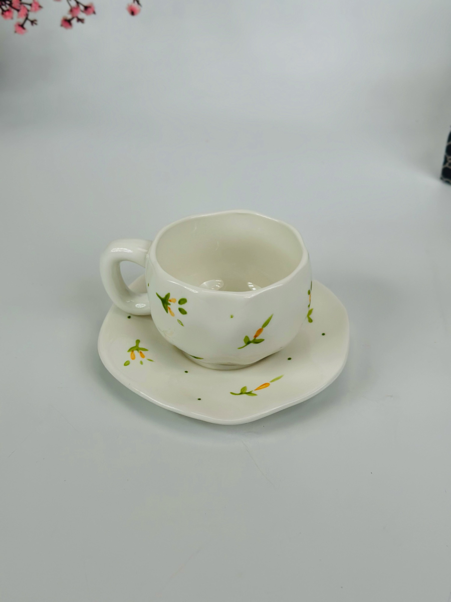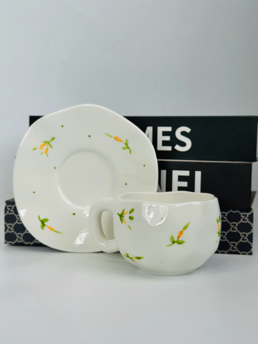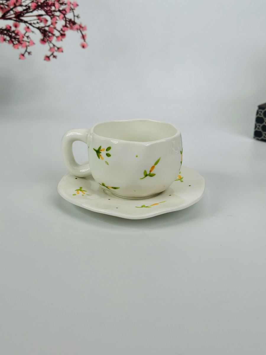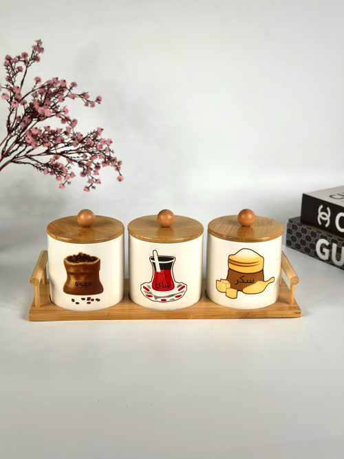 طقم سكر وشايي سراميك مصور مع ستاند بامبو قياس وسط
