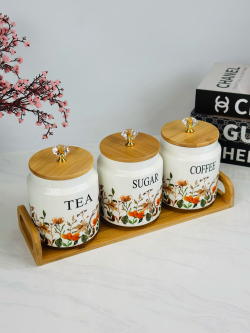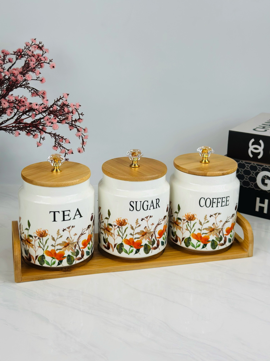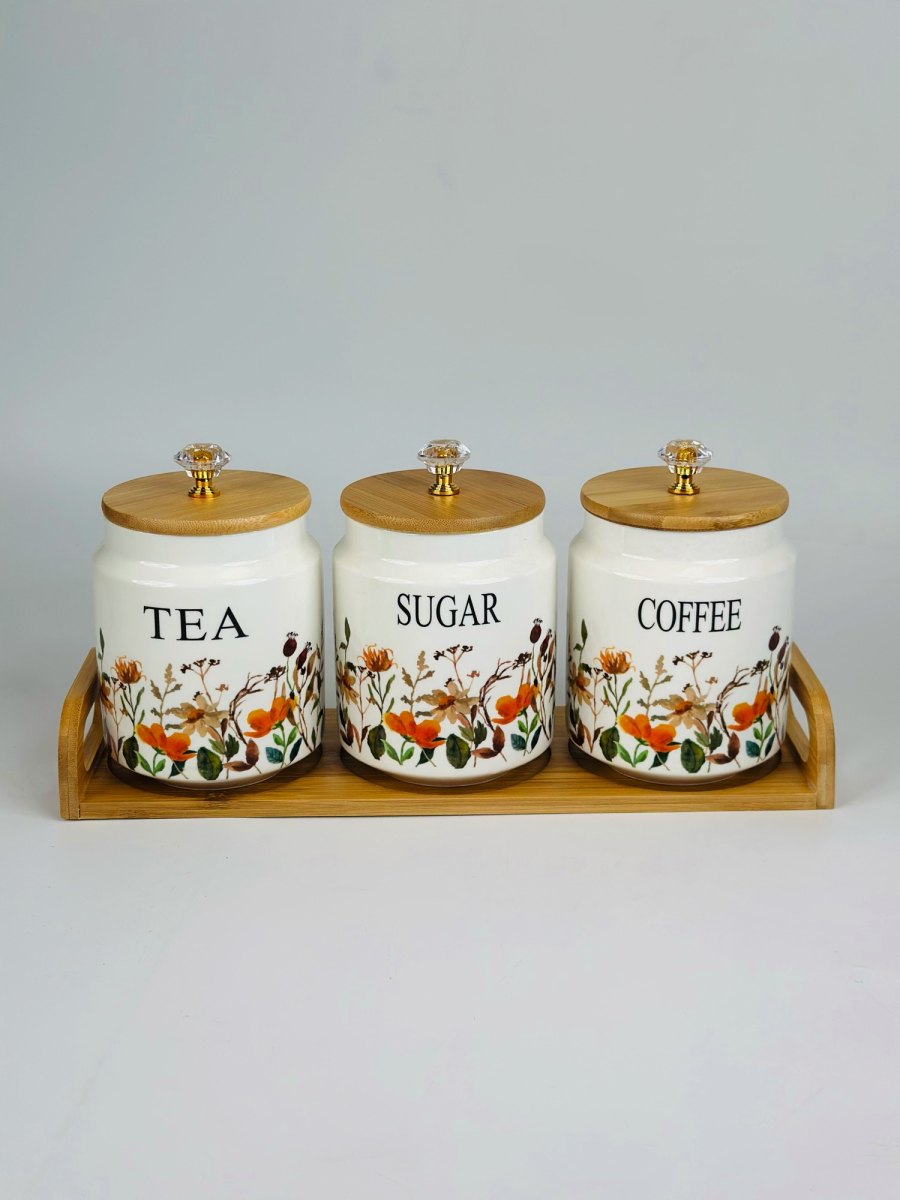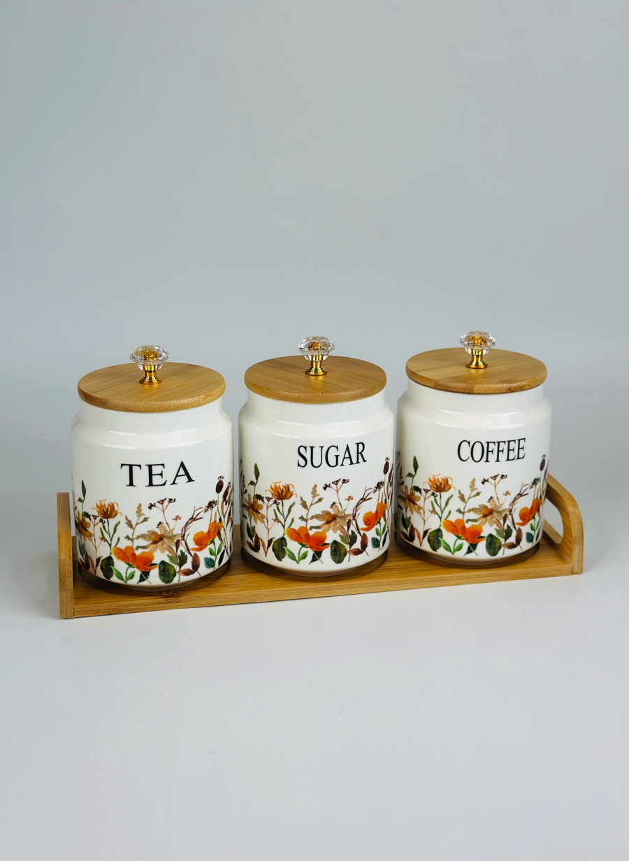 طقم سكر و شايي و قهوه سيراميك وقاعدة بامبو زهرة A