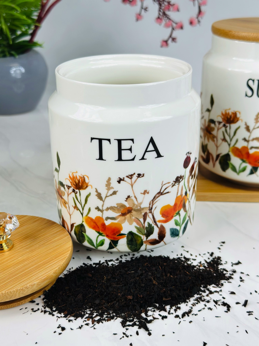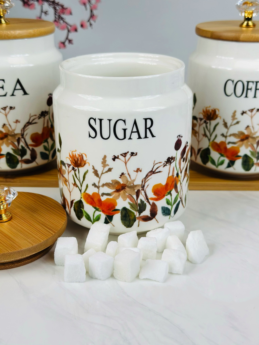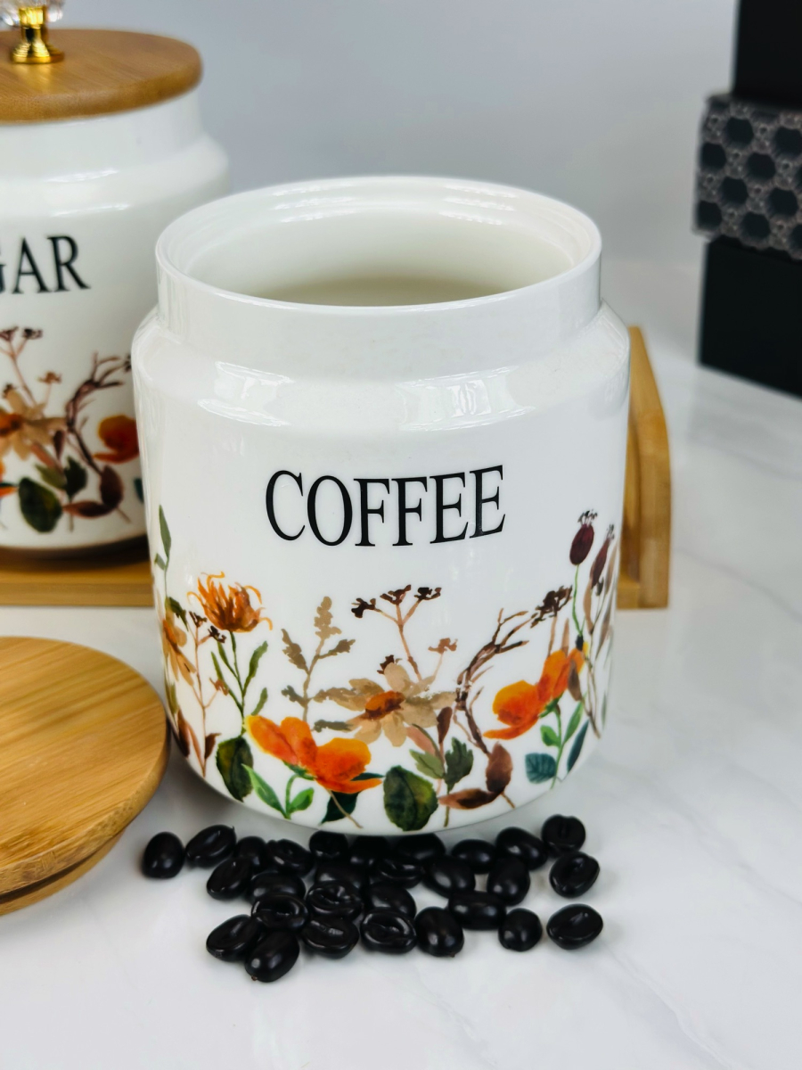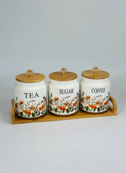 طقم سكر و شايي و قهوه سيراميك وقاعدة بامبو زهرة A