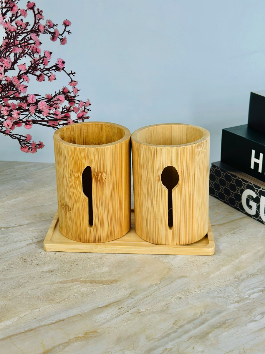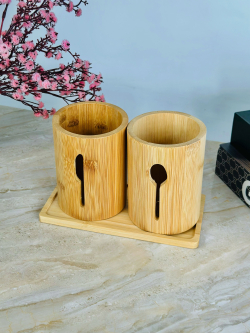 سيت سكر و شايي و قهوه سيراميك و قاعدة بامبو bh-3