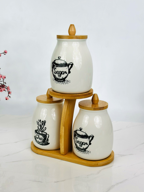 طقم سكر و شايي و قهوه سيراميك و قاعدة بامبو bh-1