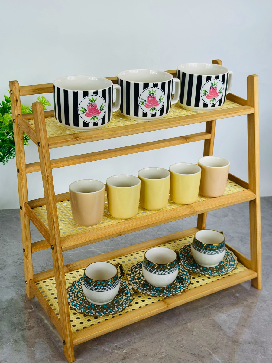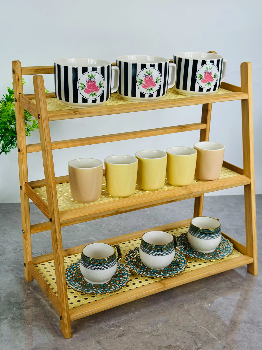 طقم سكر و شايي و قهوه سيراميك و قاعدة بامبو bh-3