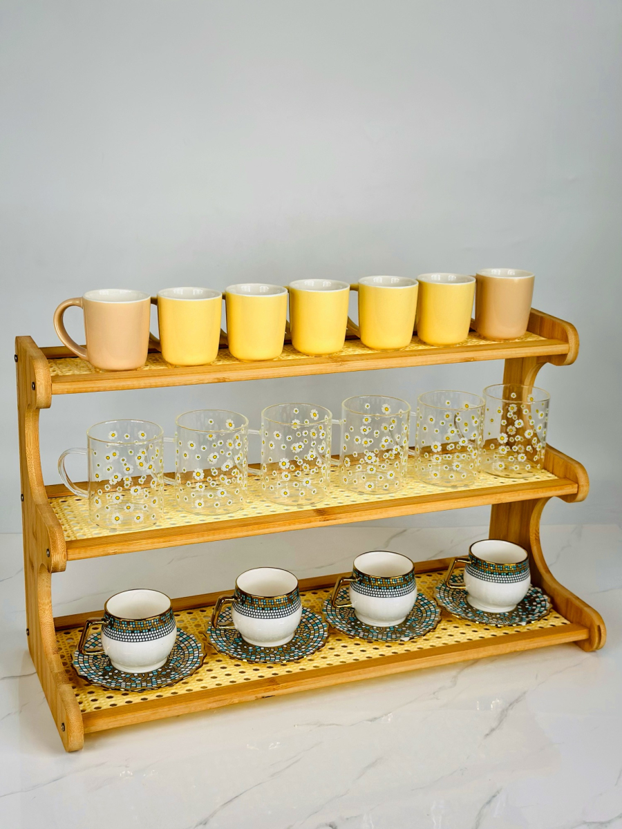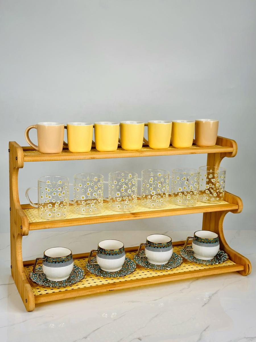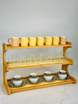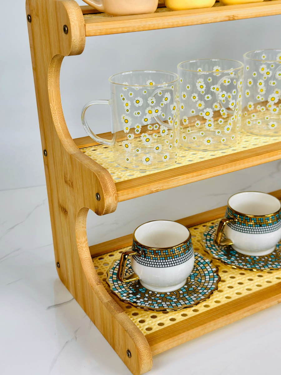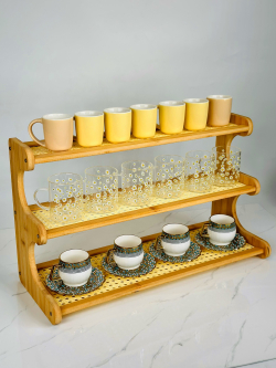 طقم سكر وشايي سيراميك شكل سلم مع ستاند بامبو انكليزي 4042