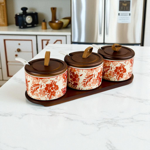 طقم بهارات و سكر و شايي سيراميك ملكي صغير نقش احمر