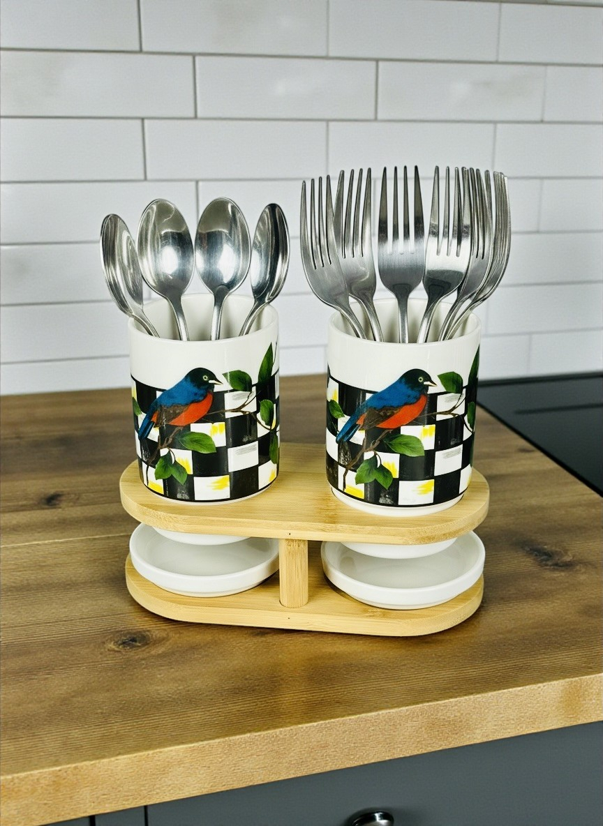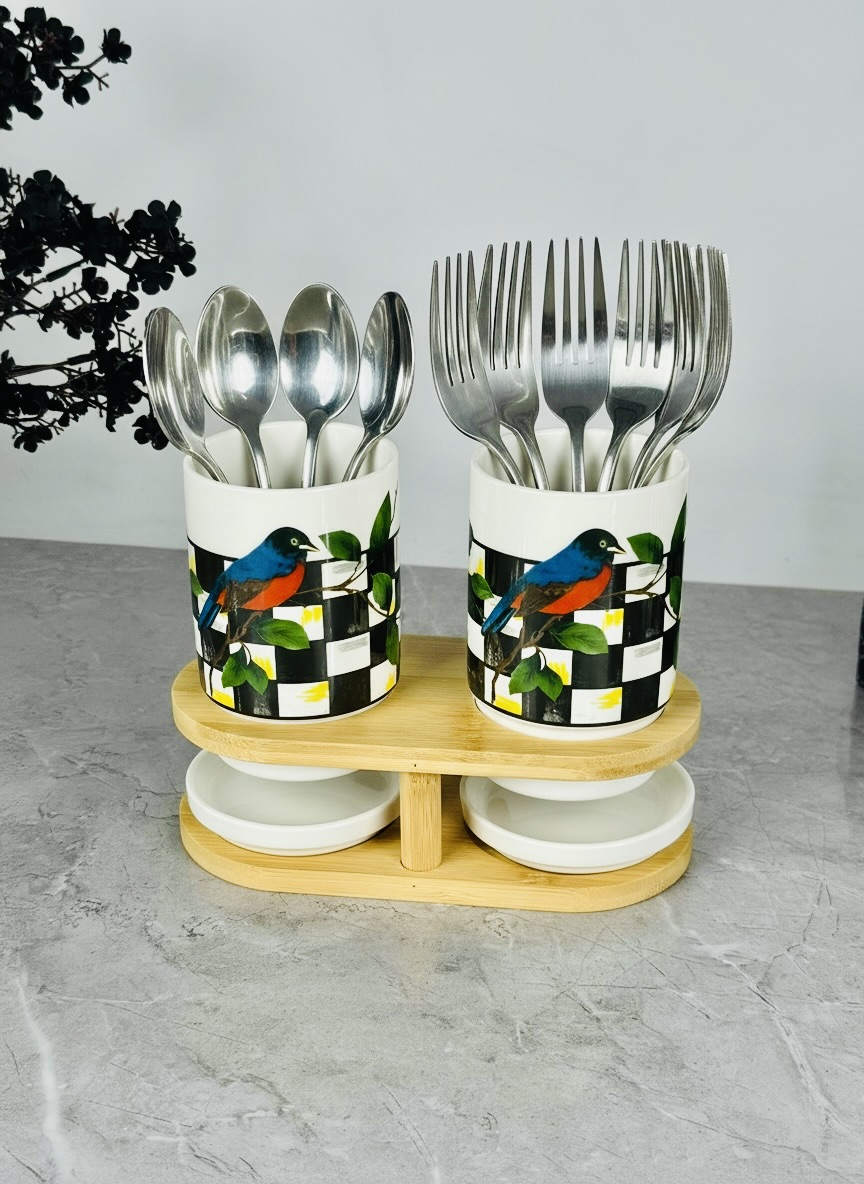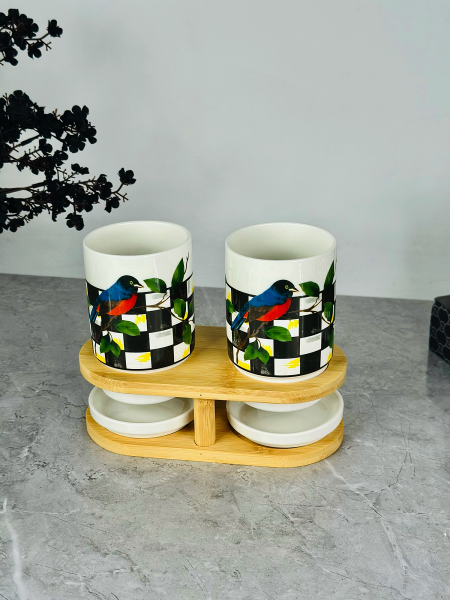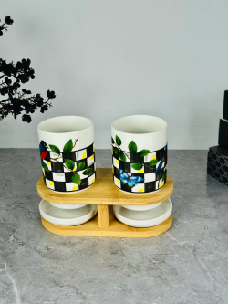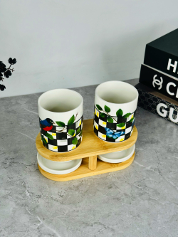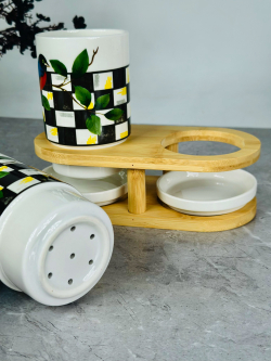 سيت سكر و شايي و قهوه سيراميك و قاعدة بامبو bh-1